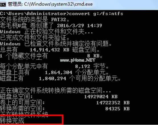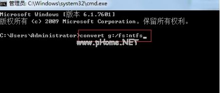 3、在彈出的命令提示窗口中輸入’convert g:/fs:ntfs’并回車確定。(g:/代表U盤所在盤符)