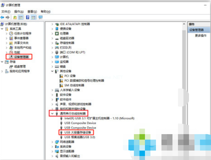 1、進入到[計算機管理]界面,點擊[設(shè)備管理器],找到[通用串行總線控制器],雙擊[USB大容量存儲設(shè)備]。