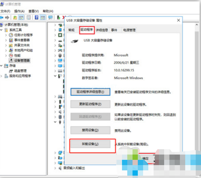 2、接著在彈出的窗口中,點擊[驅(qū)動程序] - [卸載設(shè)備] -[確定] ,卸載完成之后系統(tǒng)會自動加載U盤驅(qū)動,最后檢查一下U盤是否被讀取,再將U盤重新插入電腦。