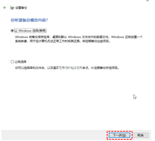 5、在希望備份的內(nèi)容頁面中有兩個(gè)選項(xiàng):分別為讓W(xué)indows選擇和讓我選擇,這里我們建議您選擇“讓我選擇”,然后單擊“下一步”。