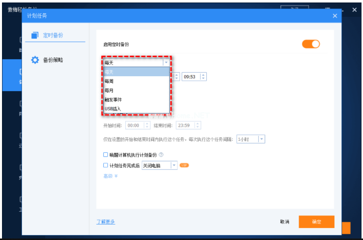 3、如果您不想每次都需要自己手動(dòng)執(zhí)行一次備份任務(wù)的話,可以單擊左下角的“定時(shí)備份”選項(xiàng)以選擇您想要的定時(shí)備份計(jì)劃(如果您需要讓U盤插入自動(dòng)執(zhí)行備份任務(wù)的話,需要將其升級(jí)為VIP解鎖此功能),設(shè)置完畢后點(diǎn)擊“確定”。