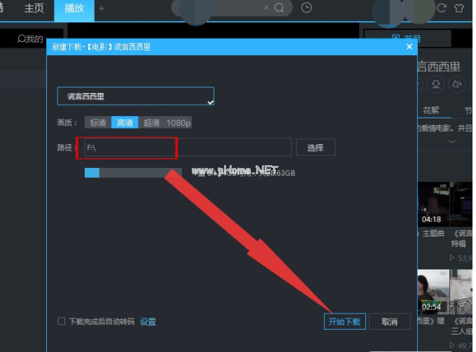 3、出現(xiàn)下載的界面,此時會讓你選擇電影的畫質(zhì)(越靠后清晰度越高),在下面會有一個系統(tǒng)的默認(rèn)下載地址,這時候就需要我們點(diǎn)擊右邊的目錄進(jìn)行自己調(diào)節(jié)下載目錄: