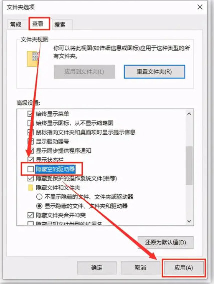 2、打開文件夾選項界面后,點擊切換查看選項卡,取消勾選“隱藏空的驅動器”,點擊“應用”即可。