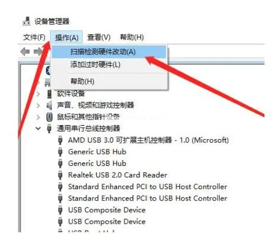 6、再點擊“操作”-“掃描檢測硬件改動”;