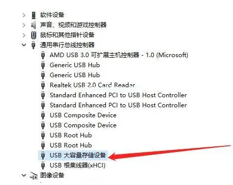 3、在設備管理器窗口中,點擊展開“通用串行總控制器”,選擇“USB大容量存儲設備”;