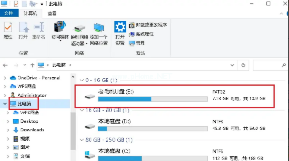 2、單擊窗口左側(cè)的“此電腦”并檢查相應(yīng)的 USB 存儲(chǔ)器是否顯示在“設(shè)備和驅(qū)動(dòng)器”列表中。