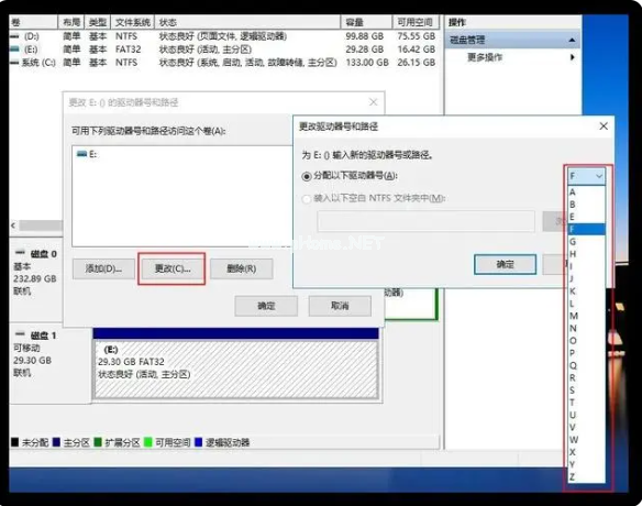 2、在彈出的窗口中點(diǎn)擊更改,隨便選擇一個(gè)未被占用的盤符,點(diǎn)擊確定后,電腦就會(huì)重新識(shí)別U盤并安裝相關(guān)驅(qū)動(dòng)。