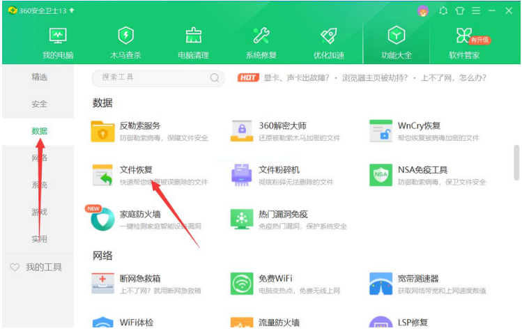 2、點(diǎn)擊左側(cè)的“數(shù)據(jù)”,選擇其中的“文件恢復(fù)”點(diǎn)擊添加,即可成功下載安裝好360u盤數(shù)據(jù)恢復(fù)工具。