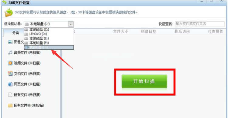 3、這時鼠標(biāo)點(diǎn)擊打開工具,選擇需要恢復(fù)的u盤,點(diǎn)擊開始掃描。