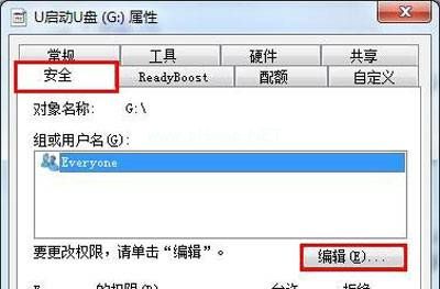 2、打開U盤的“屬性”后,選擇“安全”選項(xiàng)卡,點(diǎn)擊“編輯”按鈕,如下圖所示: