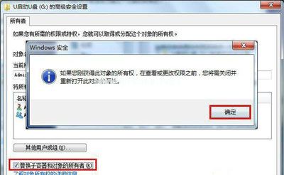 4、勾選“替換子容器和對(duì)象的所有者”,之后就會(huì)出現(xiàn)提示窗口,無需其他操作,單擊“確定”即可,然后再單擊“應(yīng)用、確定”按鈕,如下圖所示: