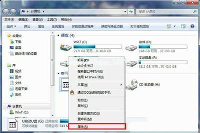 1、首先我們打開“計(jì)算機(jī)”找到插入U(xiǎn)盤的圖標(biāo),并且右鍵點(diǎn)擊,彈出菜單欄后找到并且點(diǎn)擊“屬性”這一選項(xiàng),如下圖所示: