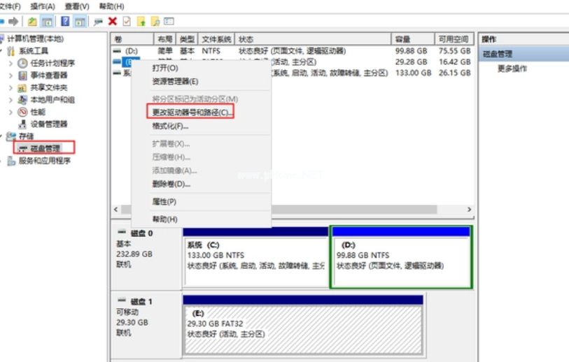 1、進(jìn)入到計(jì)算機(jī)管理界面,在右側(cè)“存儲(chǔ)”的“磁盤管理”下,找到“可移動(dòng)磁盤”,點(diǎn)擊選擇“更改驅(qū)動(dòng)器號(hào)和路徑”;