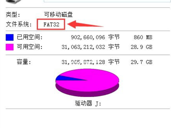 3、此時(shí)即可看到該U盤(pán)格式類(lèi)型為FAT32,這種格式較早,不支持存放超過(guò)4G的文件,需要更改其格式。