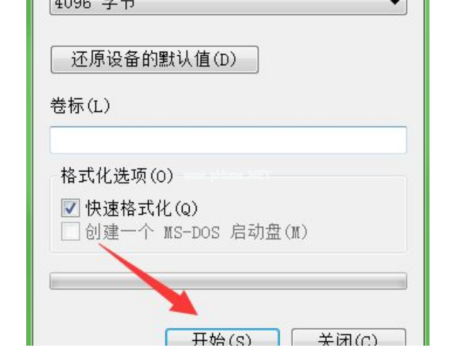 6、最后,點(diǎn)擊最下方的開(kāi)始按鈕,即可立即開(kāi)始,這樣就不可以終止,格式更改完成后,U盤(pán)內(nèi)容會(huì)清空。這樣就可以拷貝大文件了。