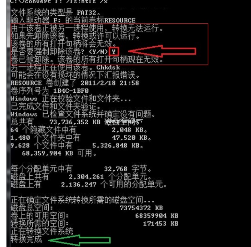 3、按回車(chē),如提示正在使用,請(qǐng)輸入 Y 強(qiáng)制執(zhí)行。轉(zhuǎn)換完成后就可以傳輸大文件了。