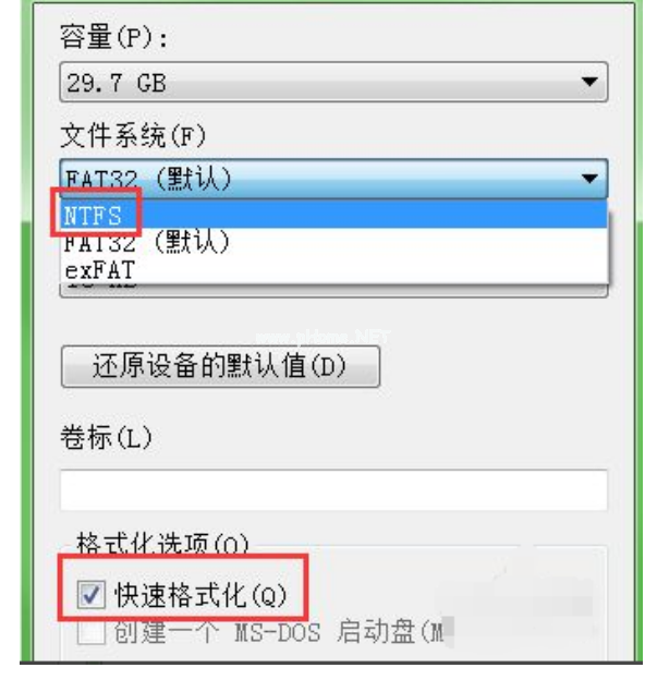 5、然后需要設(shè)置配置選項(xiàng),如圖選擇為NTFS格式,該格式支持大文件,下方快速進(jìn)行格式化選項(xiàng)可以勾選。