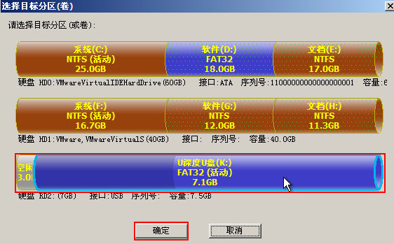 4、然后在選擇目標(biāo)分區(qū)中,選擇自己需要克隆的分區(qū),然后點擊“確定”按鈕,如下圖所示: