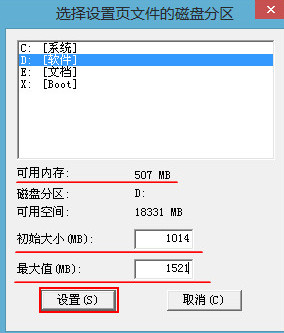 3、打開設(shè)置虛擬內(nèi)存工具后,首先選擇一個非系統(tǒng)盤,能夠看到可用內(nèi)存507MB,可以在設(shè)置虛擬內(nèi)存時選擇最大值為其三倍,初始值設(shè)定可以從0開始,初始大小和最大值設(shè)置完畢,即可點(diǎn)擊“設(shè)置”進(jìn)行操作,如下圖所示: