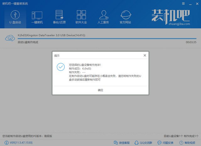 6、等待U盤設(shè)備制作完畢,點(diǎn)擊確定,將U盤拔出。