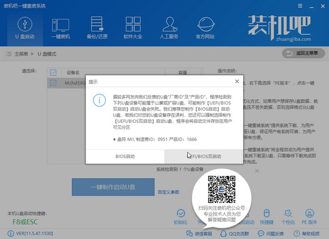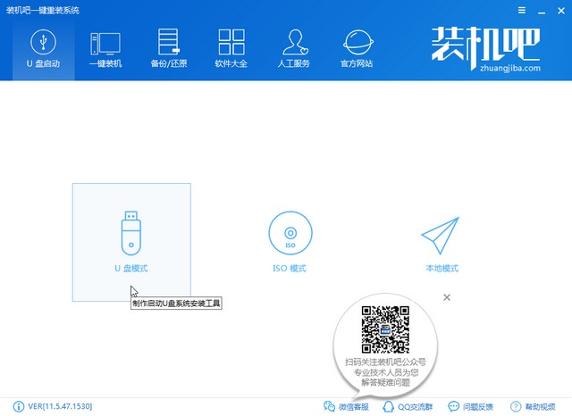 1、打開裝機(jī)吧,選擇U盤啟動U盤模式。