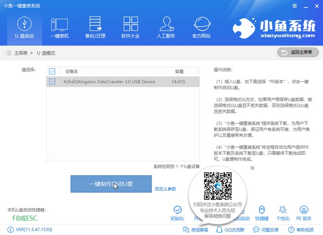 2、準(zhǔn)備一個(gè)大于8G的U盤,插入下載小魚軟件的電腦,然后備份U盤重要數(shù)據(jù)。雙擊打開小魚系統(tǒng),選擇U盤啟動(dòng),U盤模式。