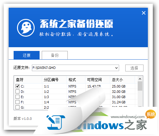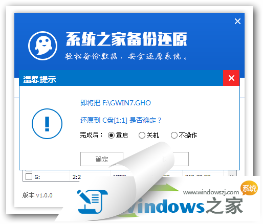 3、系統(tǒng)之家Ghost安裝器會自動識別U盤裝系統(tǒng)時所需的GHOST映像路徑,選擇完成后選擇您所需要安裝系統(tǒng)的盤符,一般默認選擇C盤,點擊確定即可。