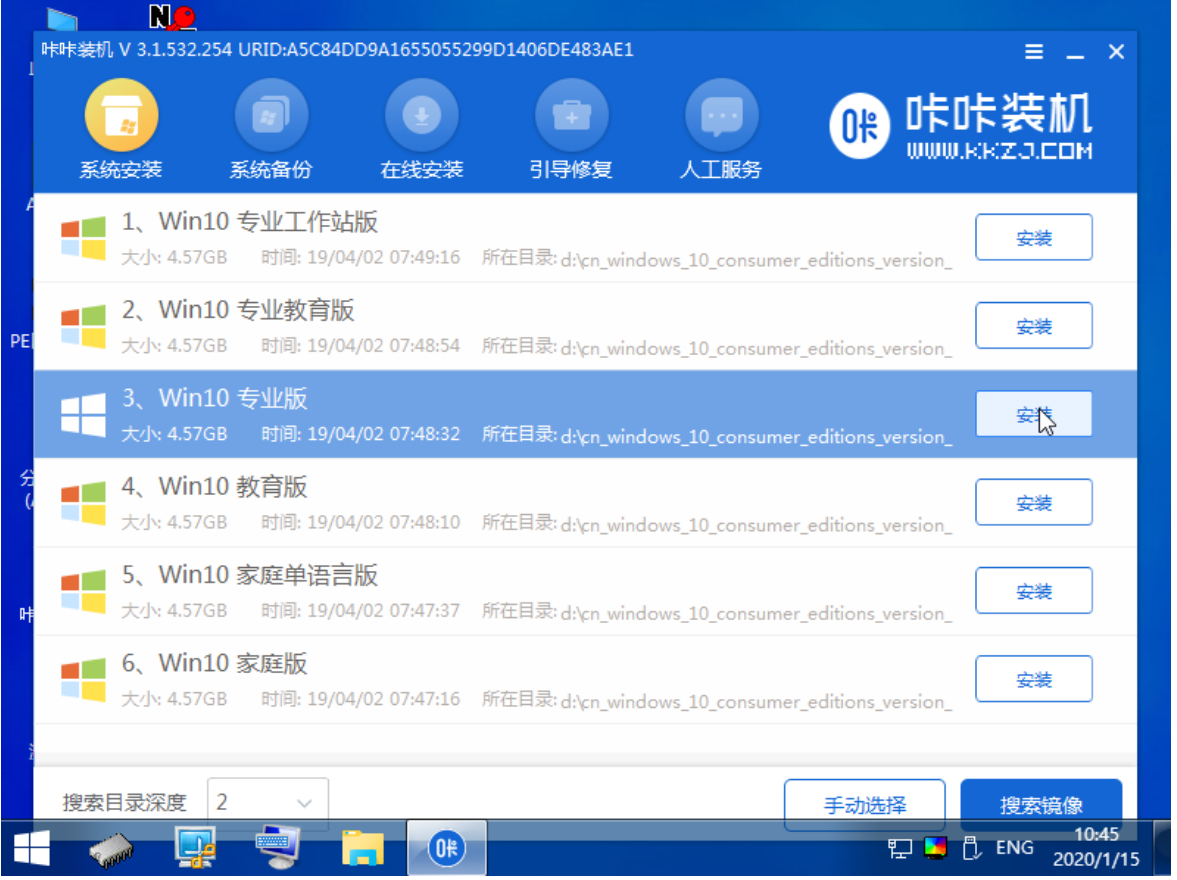 5、在pe系統(tǒng)桌面上打開咔咔裝機工具,然后選擇win10系統(tǒng)點擊安裝。