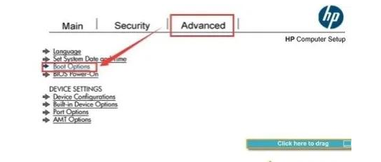 第二種:進(jìn)入電腦Bios設(shè)置U盤為第一啟動(dòng)項(xiàng)(當(dāng)?shù)谝环N方法使用快捷鍵啟動(dòng)無法選擇U盤時(shí)用此方法設(shè)置)。由于不同電腦進(jìn)入Bios設(shè)置U盤啟動(dòng)各有差異惠普電腦需要開啟USB設(shè)備啟動(dòng):1、插入U(xiǎn)盤啟動(dòng)盤,開機(jī)不停按擊F10鍵即可進(jìn)去BIOS,通過方向鍵左選擇Advanced(高級),選擇Boot Option(啟動(dòng)選項(xiàng))回車進(jìn)入,如下圖所示: