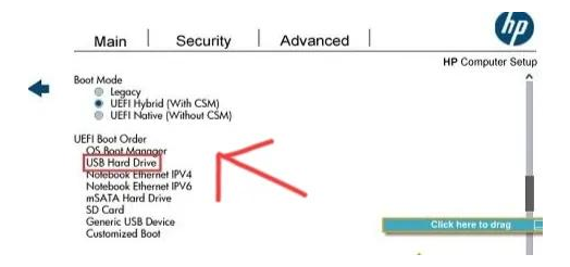 3、繼續(xù)向下拉,將UEFI Boot Order中的USB hard drive 排在第一行,點(diǎn)擊保存,即可通過USB設(shè)備啟動(dòng),如下圖所示: