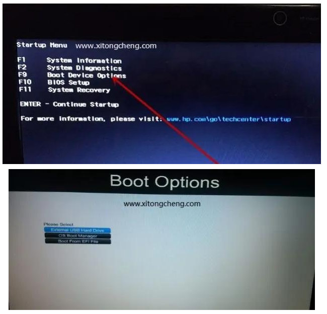 2、也可以在開機(jī)后點(diǎn)擊ESC,進(jìn)入Startup Menu菜單后,再根據(jù)提示按F9進(jìn)入Boot Device Options,即進(jìn)入啟動(dòng)選項(xiàng)菜單,如下圖所示: