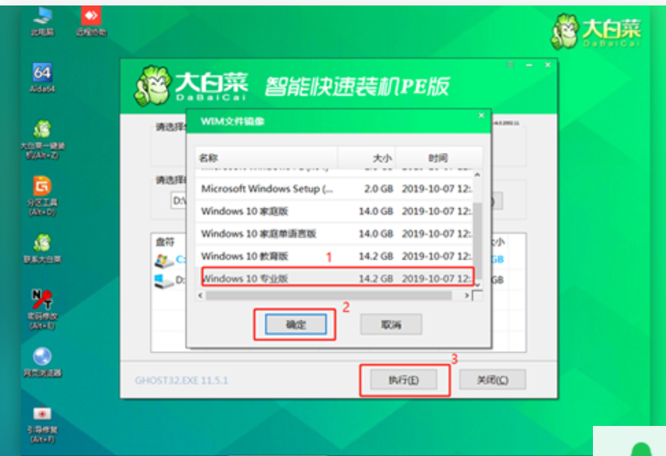 4、選擇U盤里面準(zhǔn)備的ISO鏡像文件安裝,參考下圖:選擇windows10專業(yè)版點擊“確定”,再點擊“執(zhí)行”在大白菜一鍵還原窗口。