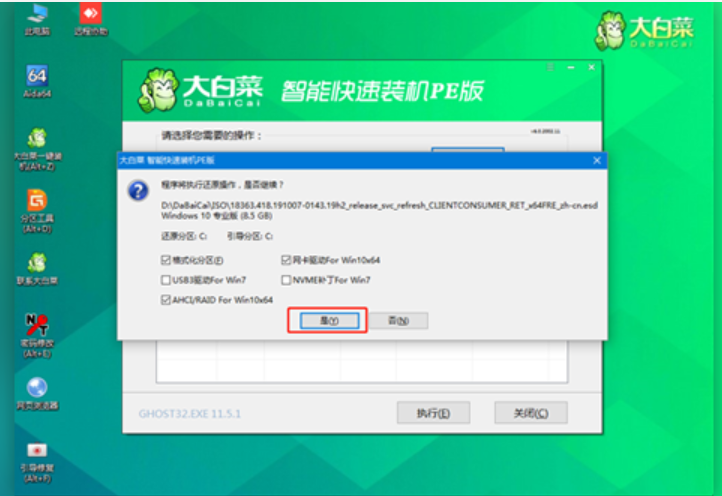 4、選擇U盤里面準(zhǔn)備的ISO鏡像文件安裝,點擊“確定”,點擊“執(zhí)行”在大白菜一鍵還原窗口。