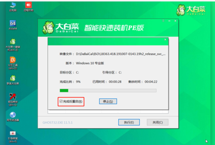 6、程序?qū)懭氪惭b完畢后點擊 “是” 重啟筆記本,同時要拔掉U盤以免再次進(jìn)入大白菜winpe界面了。
