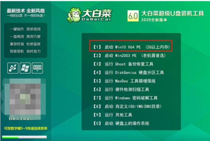 3、進(jìn)入大白菜winpe界面后,選擇“【1】啟動Win10 X64PE(2G以上內(nèi)存)”。