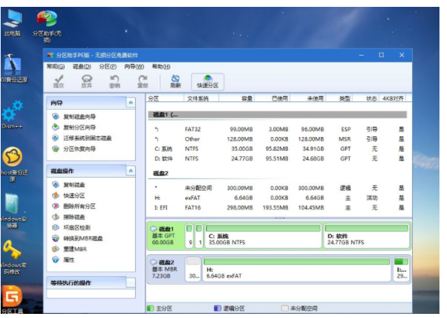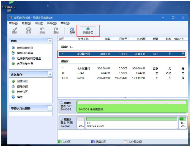4、進入到pe之后,要在uefi下安裝win10系統(tǒng),硬盤需要GPT分區(qū)表,如果之前已經(jīng)是預(yù)裝win10機型,直接執(zhí)行第7步;如果需要全盤重新分區(qū),則雙擊桌面上的【分區(qū)助手(無損)】,選擇磁盤1,點擊【快速分區(qū)】,如果你是多個硬盤,要選對,不要誤刪;