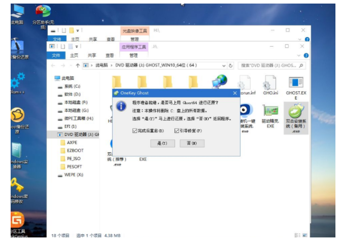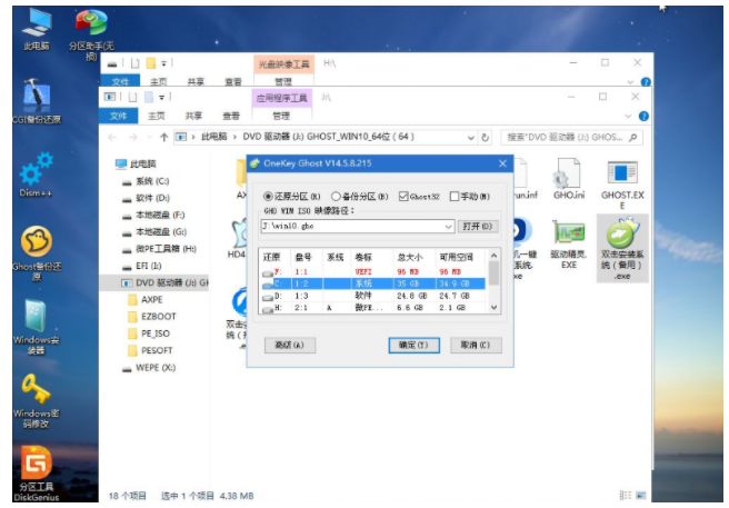 8、雙擊【雙擊安裝系統(tǒng).exe】,運行安裝工具,選擇【還原分區(qū)】,GHO WIM ISO映像路徑會自動提取到win10.gho,接著選擇安裝位置,一般是C盤,或者根據(jù)卷標(biāo)或總大小來判斷,選擇之后,點擊確定;