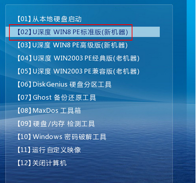 3、重啟電腦,在開(kāi)機(jī)的時(shí)候按快捷鍵,進(jìn)入圖下界面,點(diǎn)擊【02】U深度WIN8 PE標(biāo)準(zhǔn)版(新機(jī)器)