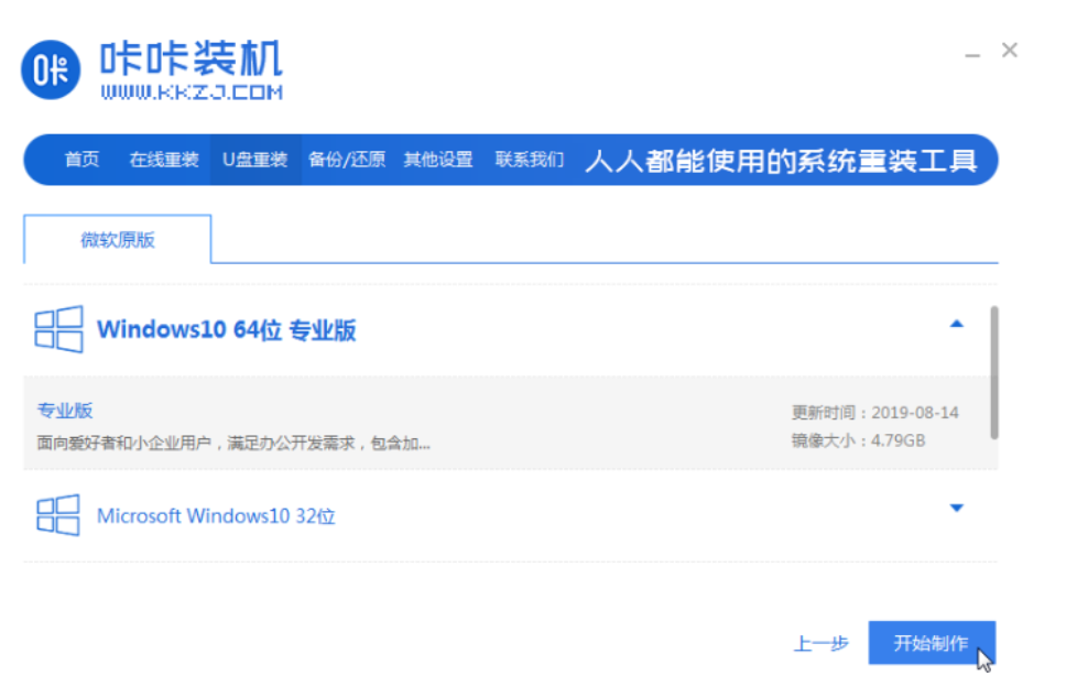 2.打開(kāi)主頁(yè)后,選擇u盤重裝系統(tǒng)模式,點(diǎn)擊開(kāi)始制作按鈕,選擇需要安裝的win10系統(tǒng)。