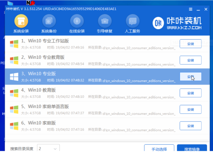 5.然后我們打開(kāi)pe系統(tǒng)桌面上的卡卡安裝軟件,選擇win10系統(tǒng)點(diǎn)擊安裝選項(xiàng)。