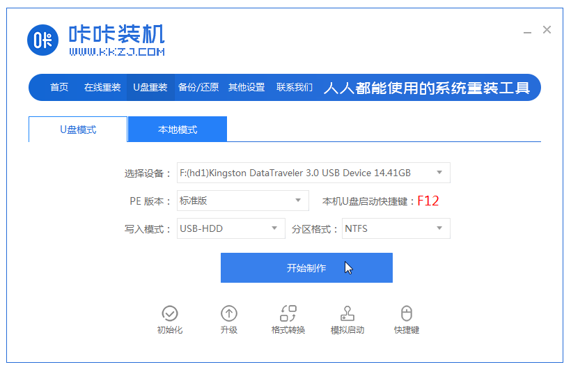 2、選擇U盤模式,點(diǎn)擊“開始制作”按鈕。