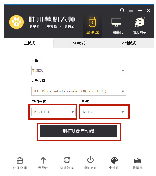 2.然后打開該軟件,插入一個(gè)空白U盤,之后將制作模式設(shè)置為“usb-hdd”,格式設(shè)置為“ntfs”,然后點(diǎn)擊“制作U盤啟動(dòng)盤”。