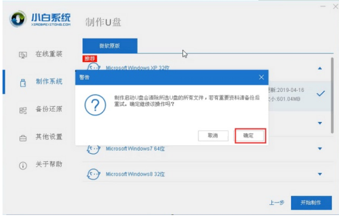 3、此時(shí)將會(huì)彈出格式化U盤(pán)操作,在確定保存好重要數(shù)據(jù)之后,點(diǎn)擊“確認(rèn)”,等待U盤(pán)制作完成之后,點(diǎn)擊重啟電腦。