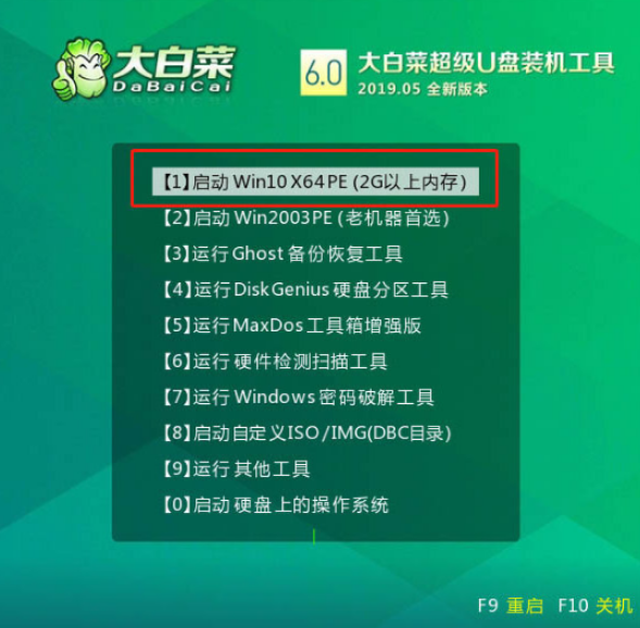 2、在菜單界面移動光標選擇第一個Win10X64PE(2G以上內(nèi)存),按回車鍵確認進入。