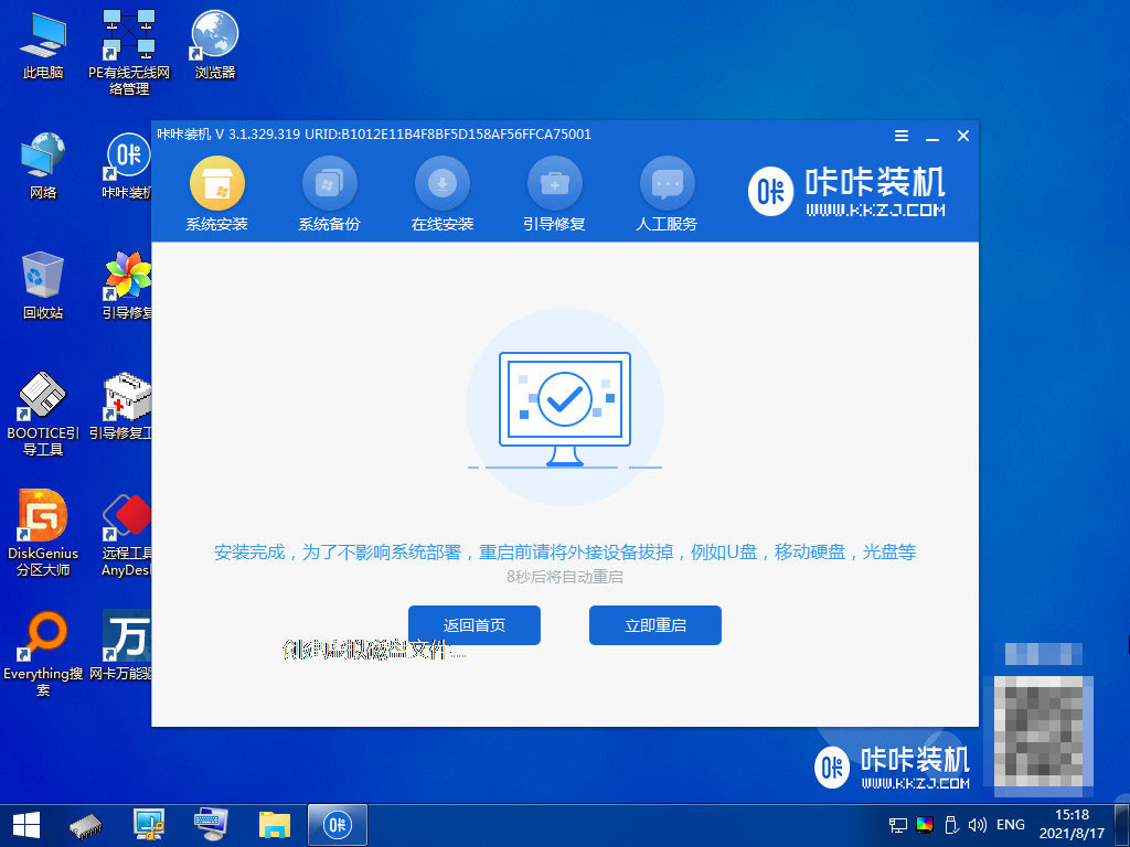 9.系統(tǒng)安裝完成后將U盤拔出,重新啟動電腦。