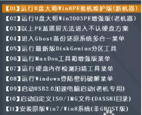 1、下載U盤裝機(jī)大師來(lái)制作的啟動(dòng)U盤。把U盤插入電腦USB插口,然后重啟電腦,按快捷鍵啟動(dòng),自己上網(wǎng)搜索電腦的快捷鍵,各各電腦都不一樣。選擇【01】項(xiàng)。