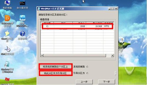 7、單擊第一個盤“c”然后選擇“將系統(tǒng)安裝到這個分區(qū)上”和“將此分區(qū)作為引導(dǎo)分區(qū)”并單擊“下一步”。