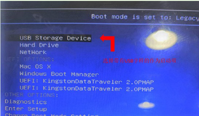 3、設(shè)置u盤啟動(dòng)盤。重啟電腦進(jìn)入開機(jī)首選項(xiàng)界面,選中U盤并回車進(jìn)入大白菜界面。