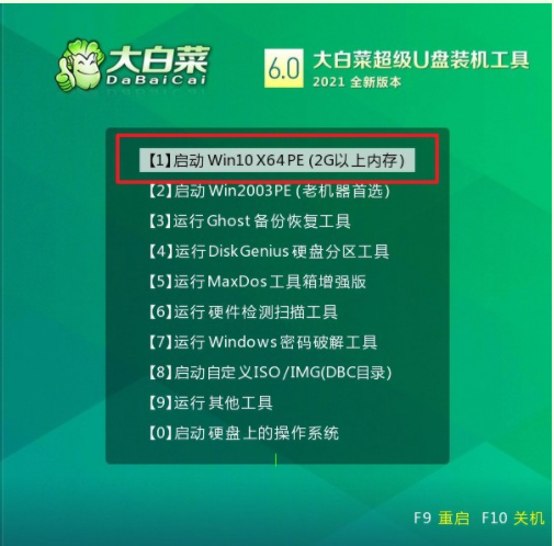 4、進(jìn)入以下界面,選擇【1】Win10X64PE(2G以上內(nèi)存),回車進(jìn)入大白菜PE桌面。
