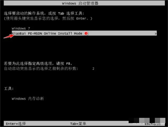 5、重啟之后會進入到pe系統(tǒng)的桌面當中,在 PE 系統(tǒng)中選擇 XiaoBai PE-MSDN Online Install Mode 選項進入PE 系統(tǒng)。